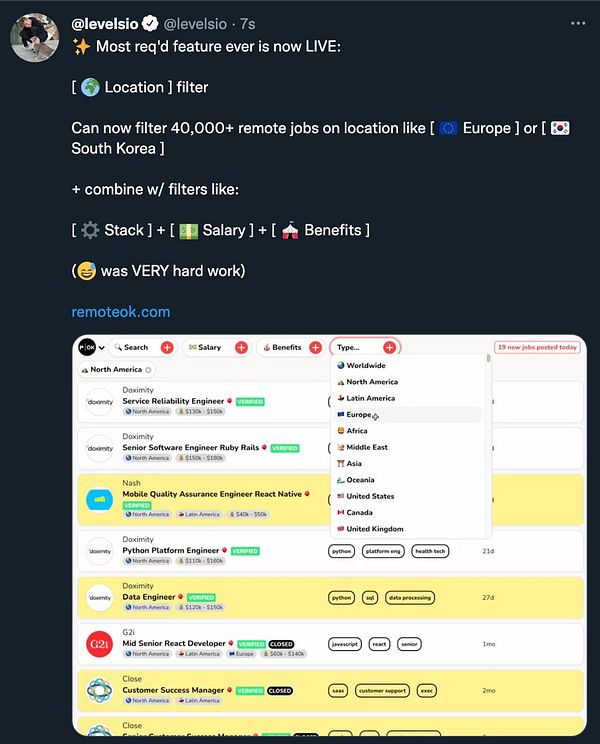 launch new filters on Twitter twitter.com/levelsio/status/1… #remoteok