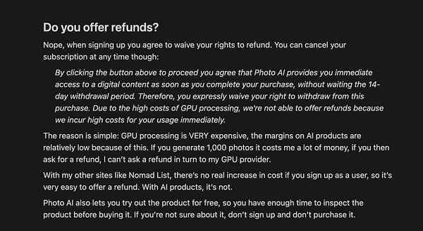 add no refund waiver because too expensive with GPUs to give refunds #photoai