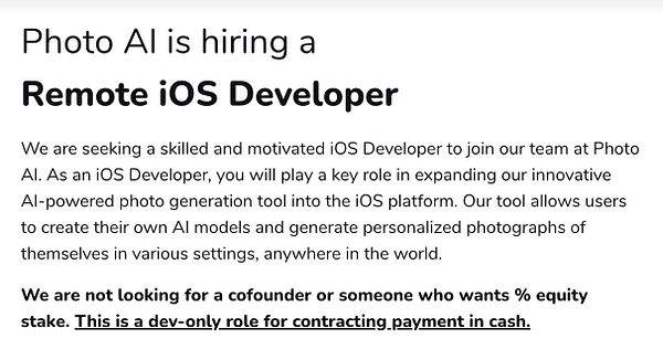 add no equity offered and cash only on job post because iOS dev I hired suddenly wants 50% of the company so I fired him 3 hours in