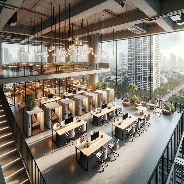 3) An urban high-rise coworking space in Bangkok with a rooftop area.