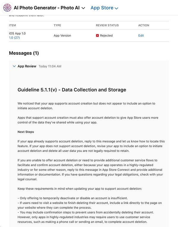 make delete account endpoint for iOS #photoai because rejected from App Store because of that