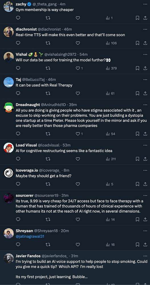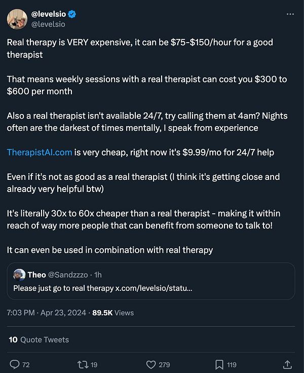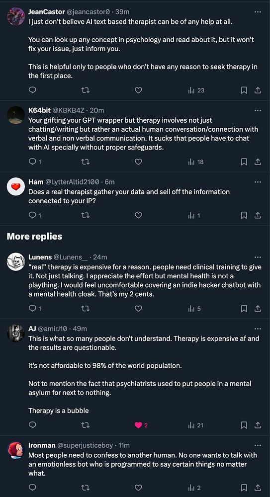 see #therapistai tweet be very controversial which is a great signal for startup viability twitter.com/levelsio/status/1…