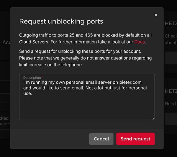 ask Hetzner to unblock port 25 so I can send email from my server #pieter
