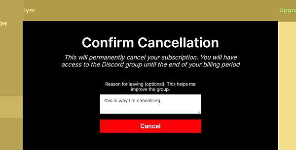 confirm cancellation modal, optional reason and mandatory red button #deutschgym