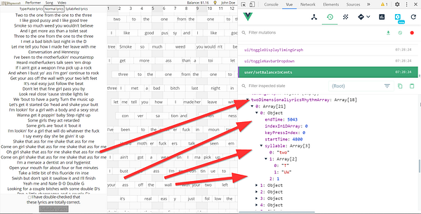 got the Vuex arrays that were showing up empty to actually show their contents; I think the mutations were taking too long to calculate the new values and so the devtools were just leaving the value blank, so I moved the calculations into Vuex actions and just have the actual assignment as mutations.
