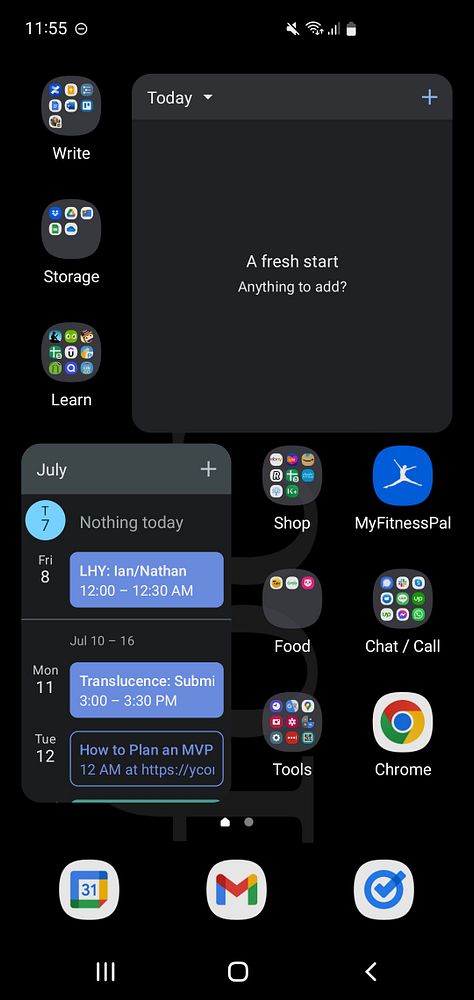 Reorganized my phone's home screen to make room for a Google Tasks widget, to hopefully help me spend my time in a more structured way.