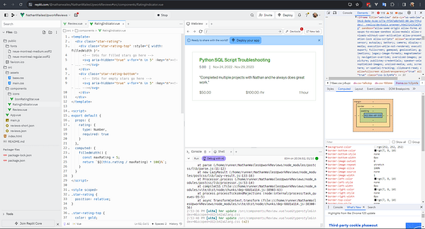 Continued working on recreating the Upwork reviews UI so I can show my Upwork reviews to potential employers who don't have Upwork accounts and thus can't easily view my Upwork reviews.