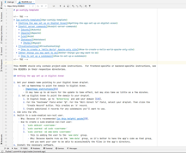 Started work on a Go+Vuetify+Digital Ocean template, copied over the parts of my README for my Flask+Vuetify+Digital Ocean template that should also apply here. Feeling good about making forward progress towards making Go apps instead of staying stuck in tutorial hell.