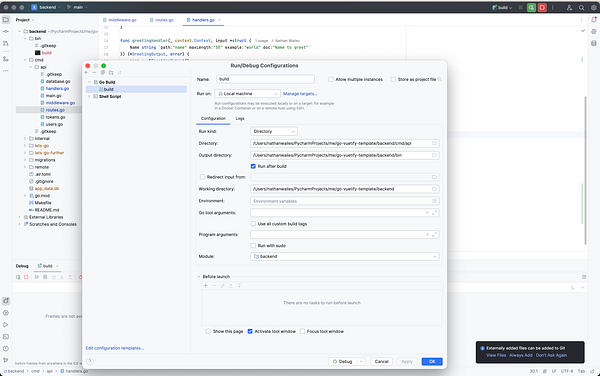 Got the GoLand debugger working with my web app backend, it was super easy, I just had to switch the configuration "Run kind" from Package to Directory and point it at /cmd/api/