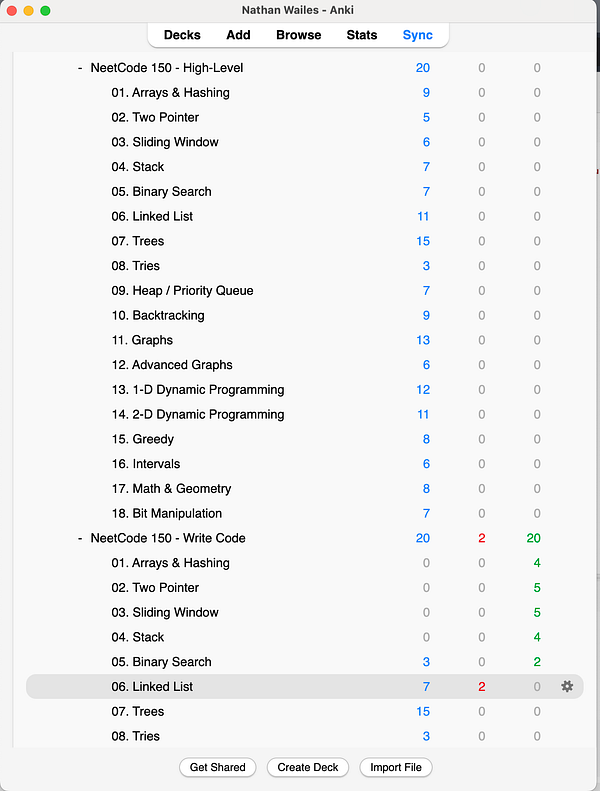 Created a copy of my NeetCode 150 Anki deck so that I can try reviewing the questions in two different ways: 1) reminding myself of high-level summaries of the solution and what I've gotten stuck on with that question in the past, and 2) actually needing to write out the code and run it against the test cases.