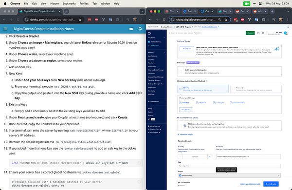 Started learning Dokku / trying to set it up with Digital Ocean. ty @ben ... joined the dokku discord; went through this guide: dokku.com/docs/getting-starte… ; switched my whatdo domain in DigitalOcean to point to the new dokku droplet ; asked for help in the forum to understand what it means for "the web UI [to be] submitted": github.com/dokku/dokku/discus… ; I think it's referring to the DO UI for creating the new droplet ; next step for tomorrow: go through this guide: dokku.com/docs/deployment/app…