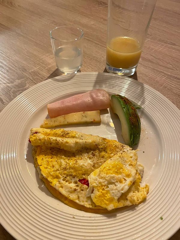 Ginger/Lemon shot (selfmade), avocado 🥑, eggs 🍳, cheese 🧀, turkey slices