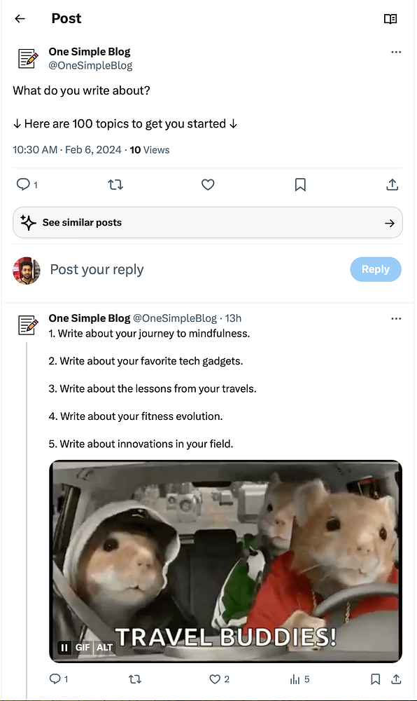 post 100 ideas for blogging in twitter account #onesimpleblog twitter.com/OneSimpleBlog/sta…
