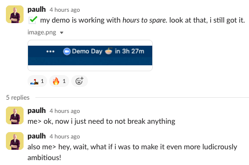 Doing the 90% of things that you have to do after the first 90% is done. Currently #signupbot email updates.