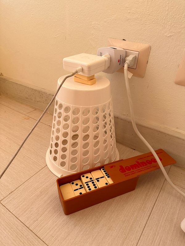 ransacking the Airbnb for building materials so I can construct something that keeps my stack of plugs in the wall. This seems safe.
