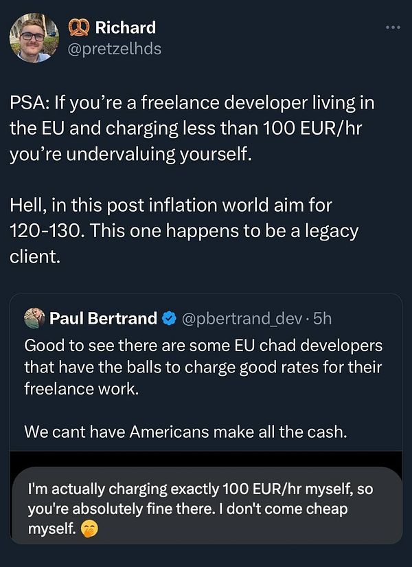 Tweet about hourly rates for freelancers in the EU: x.com/pretzelhds/status/18332…