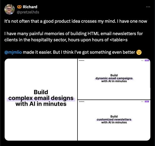 Start teasing product idea on X like I did with my last successful project — x.com/pretzelhds/status/18331…