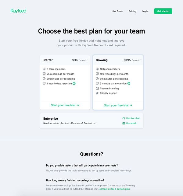 break up pricing table into 2 columns for plans + add a full width container for the enterprise plan #rayfeed