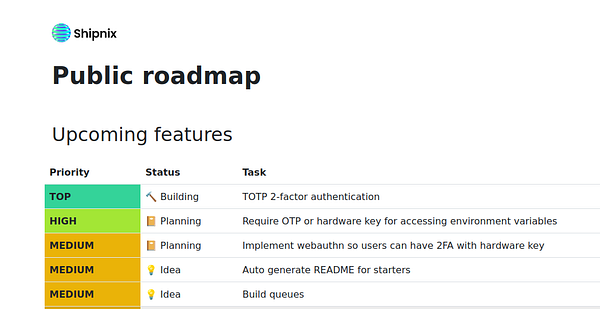 A little touch-up on the public roadmap I made for #shipnix a while a ago, and start to use it to display what features I am working on
