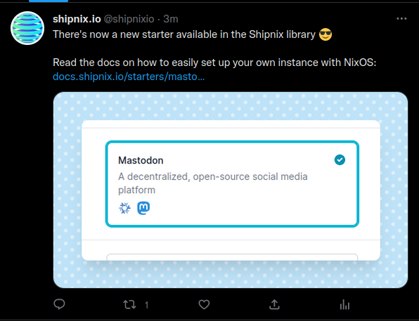 Add a Mastodon starter to #shipnix for those who want to host their own instance instead of joining an existing one, and write docs with some simple instructions docs.shipnix.io/starters/mast…