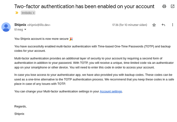 Send email when MFA is disabled, enabled or a backup code is used #shipnix