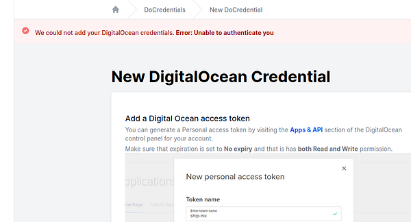 Add server-validation to form for adding DigitalOcean credentials, including when DigitalOcean API complains #shipnix