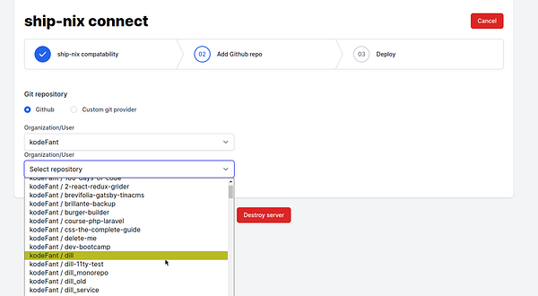 Finish front-end flow for adding existing Github repos, leaving the final backend part for tomorrow #shipnix
