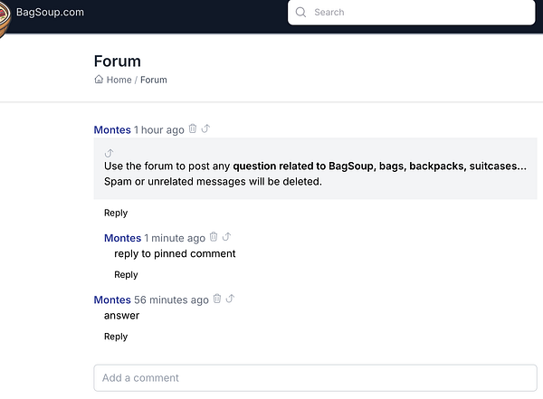 Finished the last programming task for the v1!! Made an MVP forum using the comments system, with markdown, pinned comments and thread margins πŸ₯³ #bagsoup