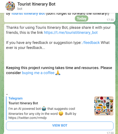 Add buy me a coffee link to the Tourist Itinerary Telegram bot