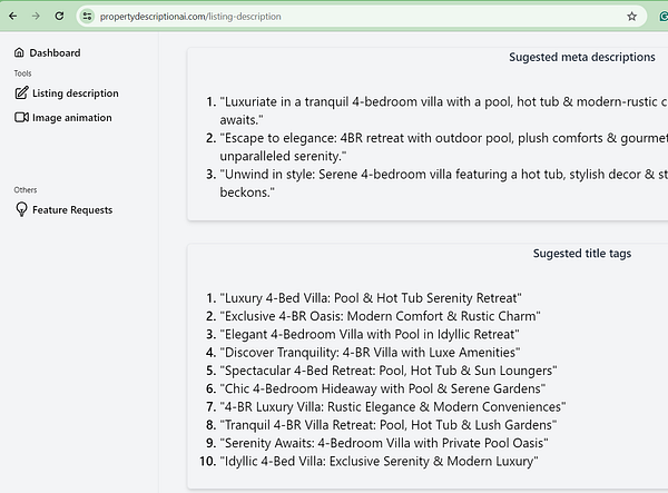 Add a feature to suggest meta desctiption and title tag #propertydescriptionAI