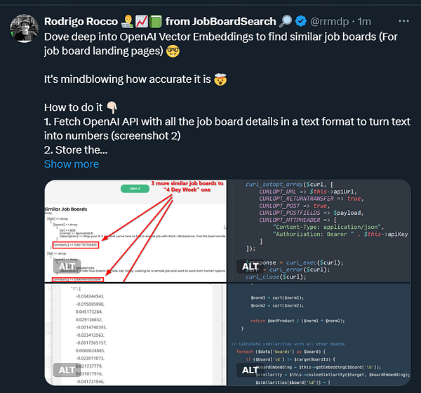 Post about how to use Vector Embeddings to find similar job boards x.com/rrmdp/status/1857768293… #jobboardsearch