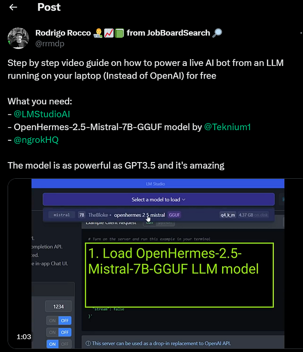 Tweet a step by step guide video on how to power a live AI app from an LLM in your laptop x.com/rrmdp/status/1727693258… #life