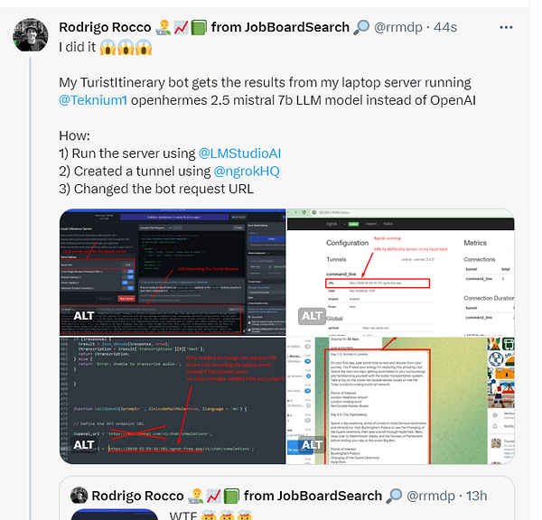 Tweet about how I made my AI TouristItinerary bot to fetch from my local LLM instead of from OpenAI x.com/rrmdp/status/1727341691… #life