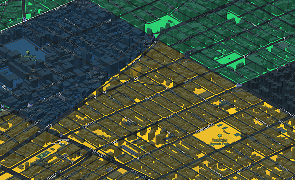 I finally figured out what I meant, it's that the building blocks are a separate dark color which disorientates me (since it has the same appearance as a street), I would love for them to just be a darker shade of their background color (maybe make them black with a 0.3 or so opacity e.g. rgba(0,0,0,0.3)), hope it helps!