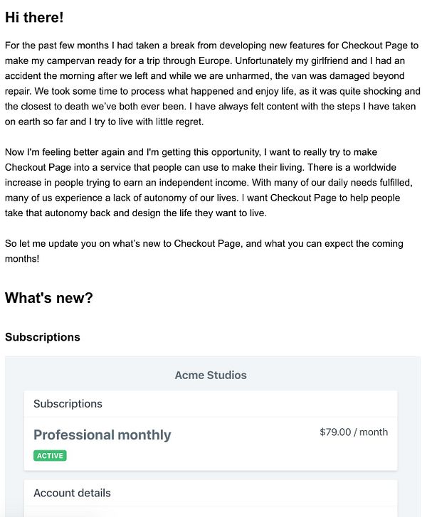 send update newsletter about subscriptions, statistics, stock and the future of Checkout Page