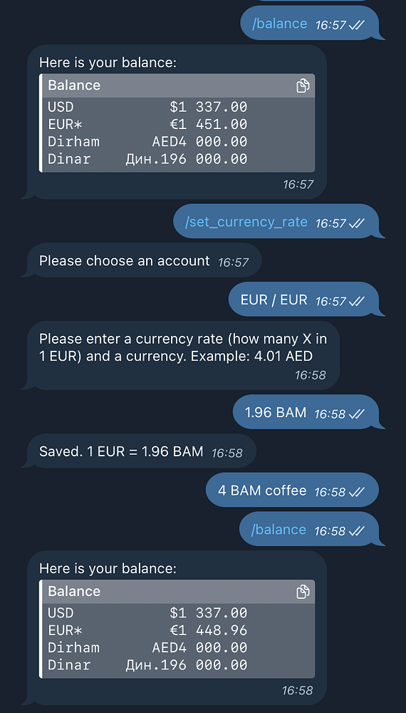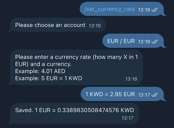 Currency conversion baby step 1. Sometimes you spend money from an account that has a different currency then what you spent. /set_currency_rate allows to set the rate once instead of converting every time or creating a "virtual" account for such expenses. Should be very useful on vacation and for digital nomads