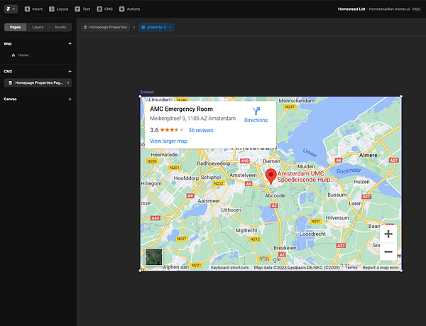 Add embed links to Framer CMS. Make them render Nearest Hospital metric for Property detail page.