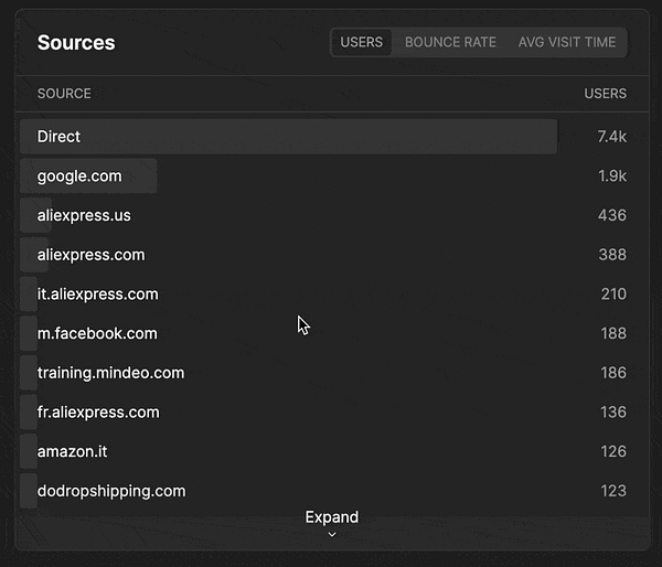 Ability to toggle and report on bounce rate and visit duration for source and country