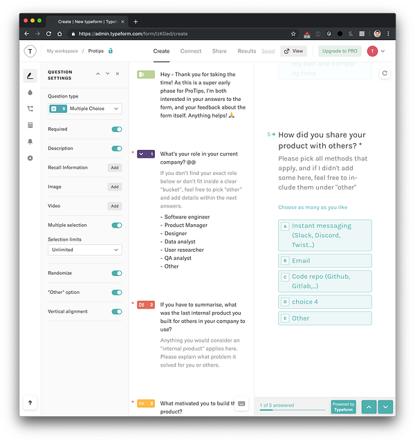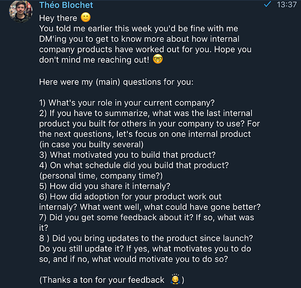 Ask user research questions over chat, both to get some initial direction and feedback on the questions themselves