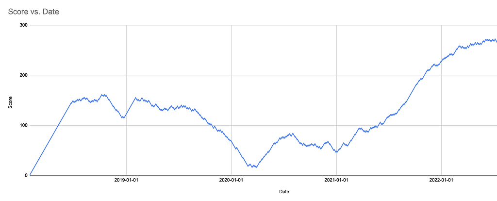 Note that long upwards trend that started around the start of 2021? That's a great indicator this person started reliably shipping (assuming a decent amount of work-related todos) but since the chart is not completely linear like in the beginning, it also means the maker didn't earn a streak from this (as there's at least a few missed days).