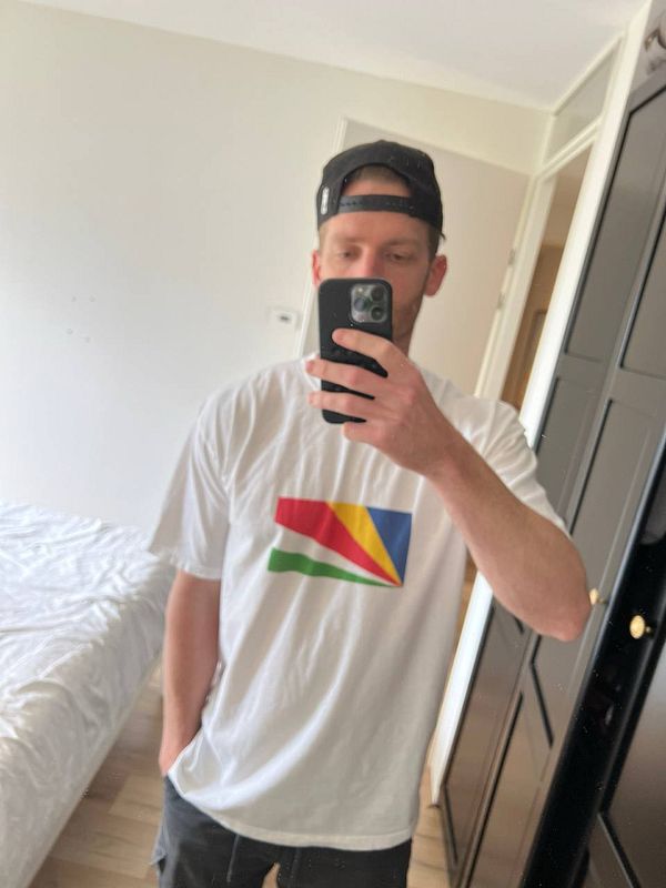 receive test merch with nice flags and see print quality is low, neck is narrow and color difference between sizes, but overall nice to sleep in or wear to the beach because I'm no fashion icon