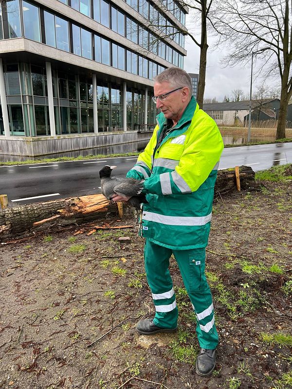 hand over meerkoet to authorities for having its foot broken when being run over by car (not mine)