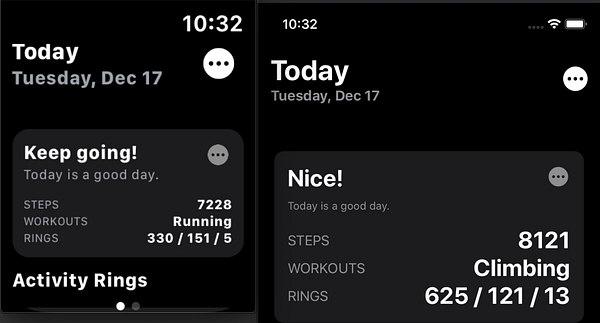 Better rendering of today summary, title is based on your performance for today, added charts for steps today insight