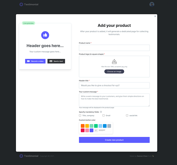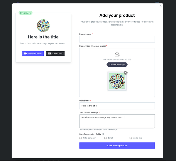 Live review in product create modal