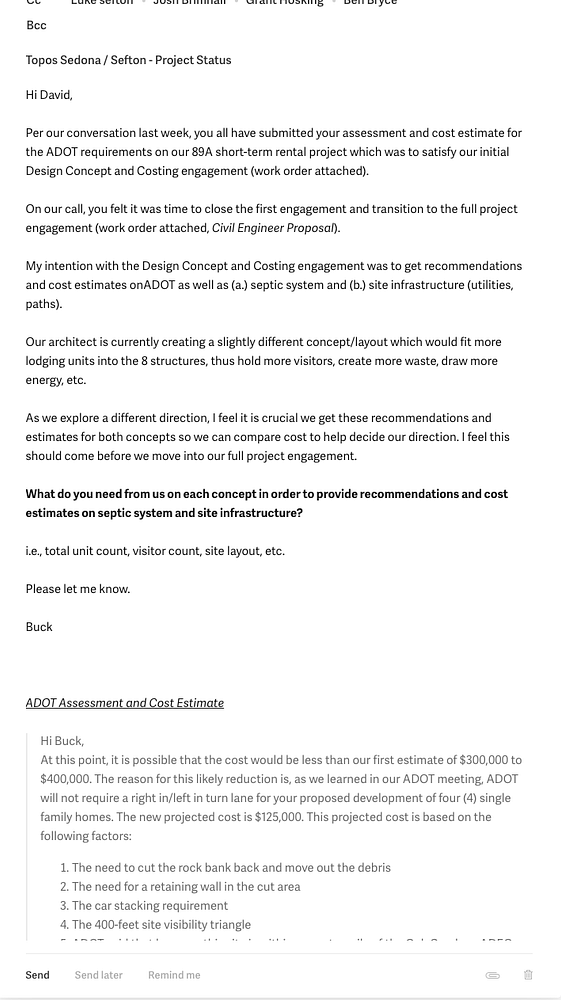 Sent Josh cost analysis on Sedona