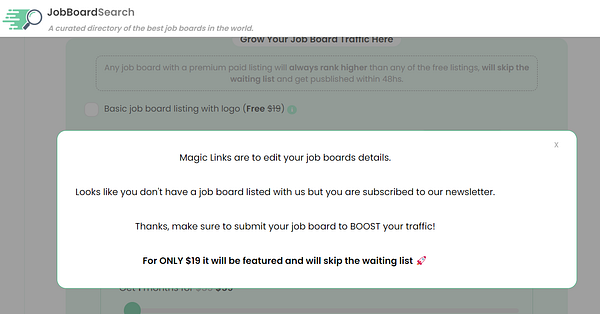 Add a modal that gets triggered when taping in the Magic Link in the founders newsletter but for subscribers that don't have a job board listed with us