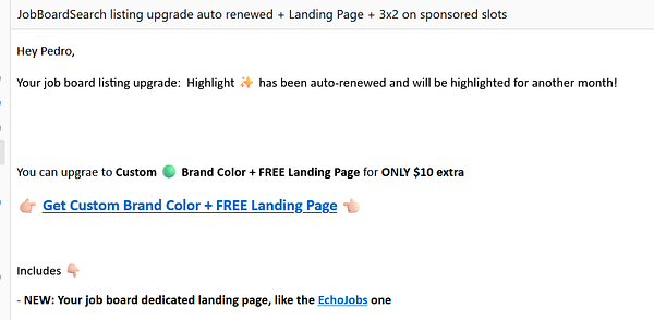 Try a new renewal job board listing email copy with a "Free Landing Page" upsale