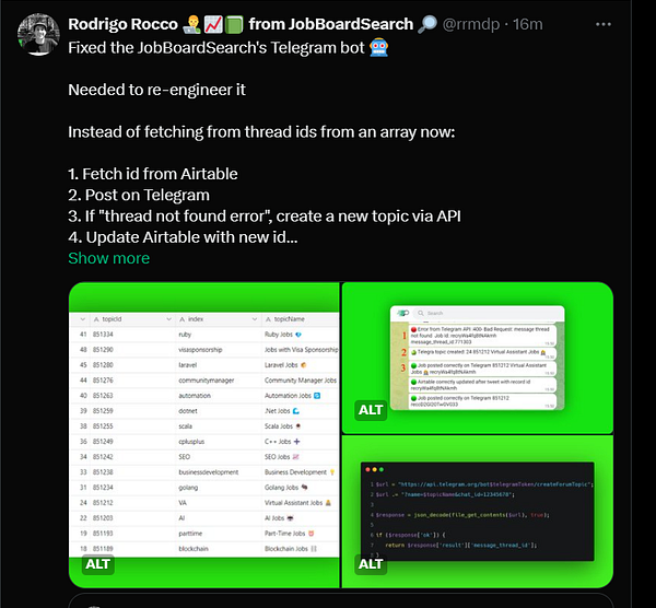 Tweet about fixing the Telegram bot by re engineering it x.com/rrmdp/status/1767906455…