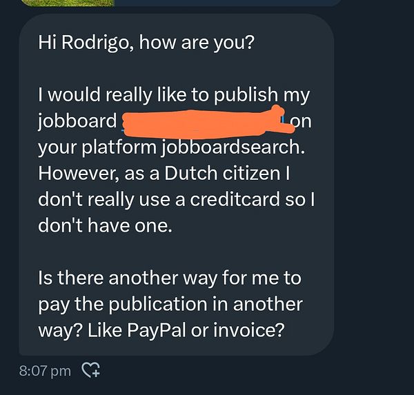 Get a DM from a job board founder wanting to advertise but saying he doesn't own a credit card 😯