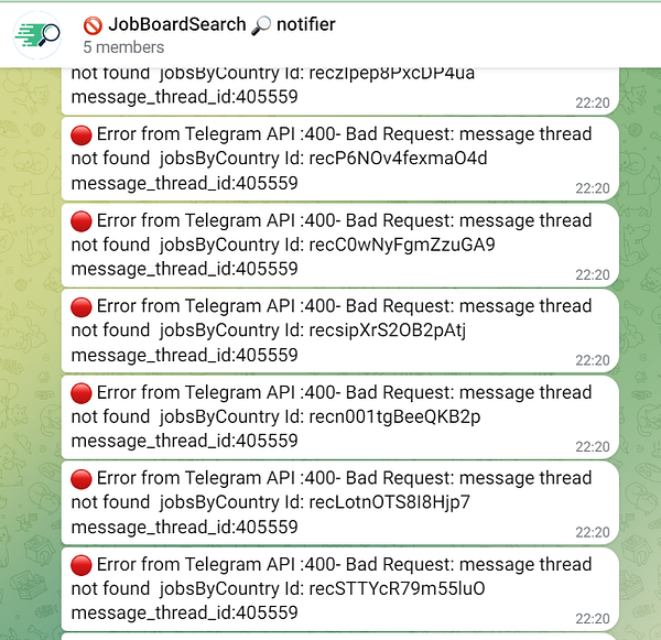 Struggle to find out with the Telegram bot suddenly stopped working reporting that the thread id doesn't exist but is not correct